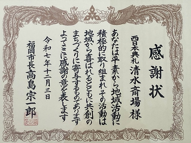 西日本典礼清水斎場は災害避難所提供で地域貢献の表彰をいただきました。