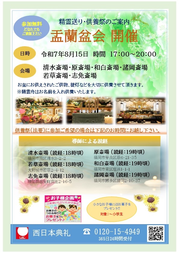 西日本典礼では15日に精霊流し(盂蘭盆会)を行います。
