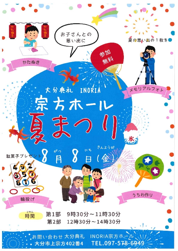 宗方ホール 夏祭りイベント開催✨ 日程:8月8日(金) 時間:一部9:30~11:30 二部12:30~14:30 斎場:INORIA宗方ホール (大分市上宗方402-4) 暑い日が続きますが、そんな暑さに負けずに夏祭りを開催します! ・かたぬき ・うちわづくり ・輪投げ ・メモリアルフォト ・事前相談コーナー ・ホール見学 どなたでも参加いただけます。 夏休み期間中ですので、お子様との参加をお待ちしております。
