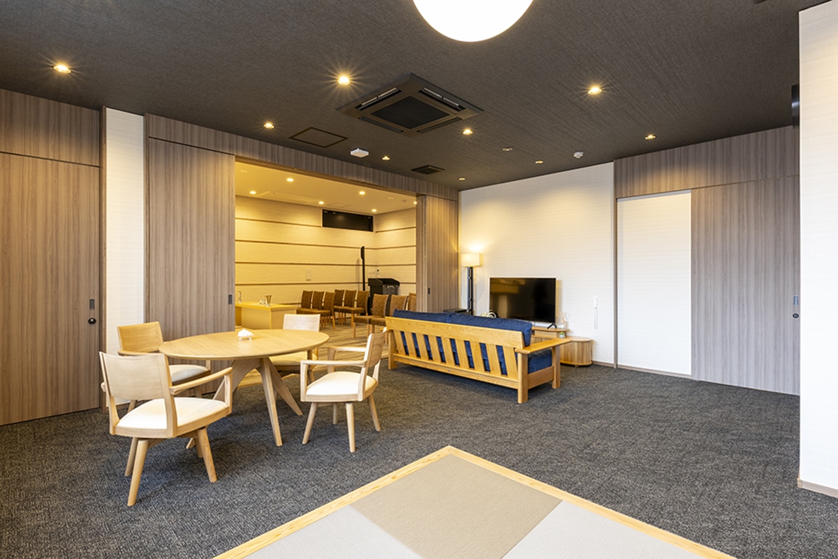 2件の葬儀を同時対応可能で、プライベート性を保ちながら複数のご葬儀に柔軟に対応。従来のお葬儀の厳かな儀式を重んじつつ、現代的な映像演出を融合させた新しい葬儀の形をご提案します。